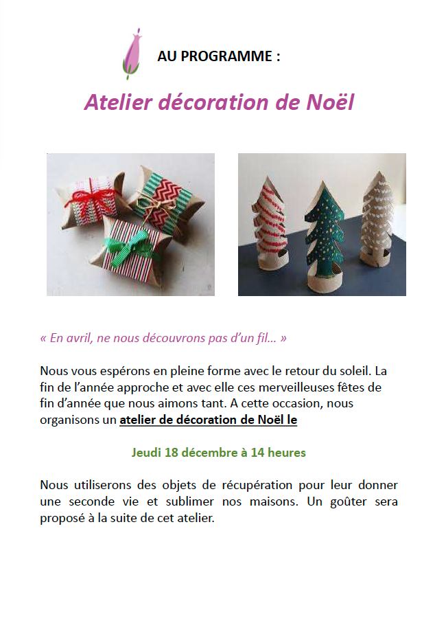 À l’occasion des fêtes de Noël, nous vous invitons à venir fabriquer votre décoration de fin d’année. Nous utiliserons des objets de récupération pour leur donner une seconde vie et sublimer nos maisons. Un goûter sera proposé à la suite de cet atelier. ![]()